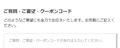 「リクエスト・クーポンコード」または 「ご質問・ご要望・クーポンコード」の欄に クーポンコードをご入力ください。