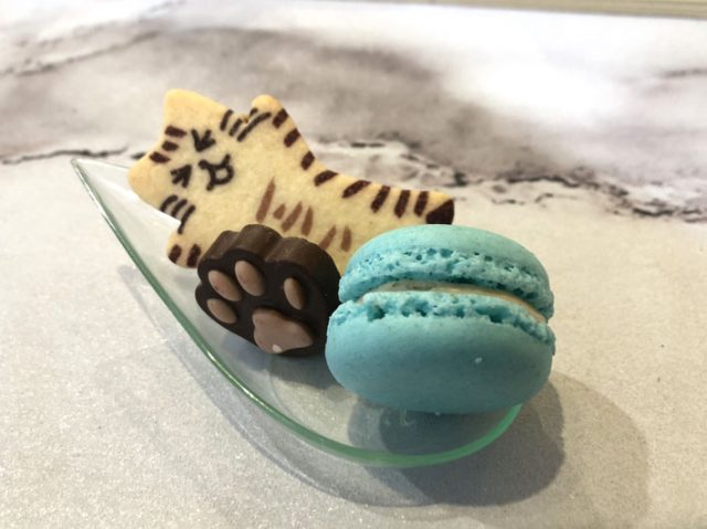 猫型クッキーは食べるのがもったいないかわいさ!肉球型のチョコはヌガー入りで、珍しい水色のマカロンはアールグレイ味。マカロンは甘めなので、ホットティーと一緒に味わうとよりおいしいさが感じられます。