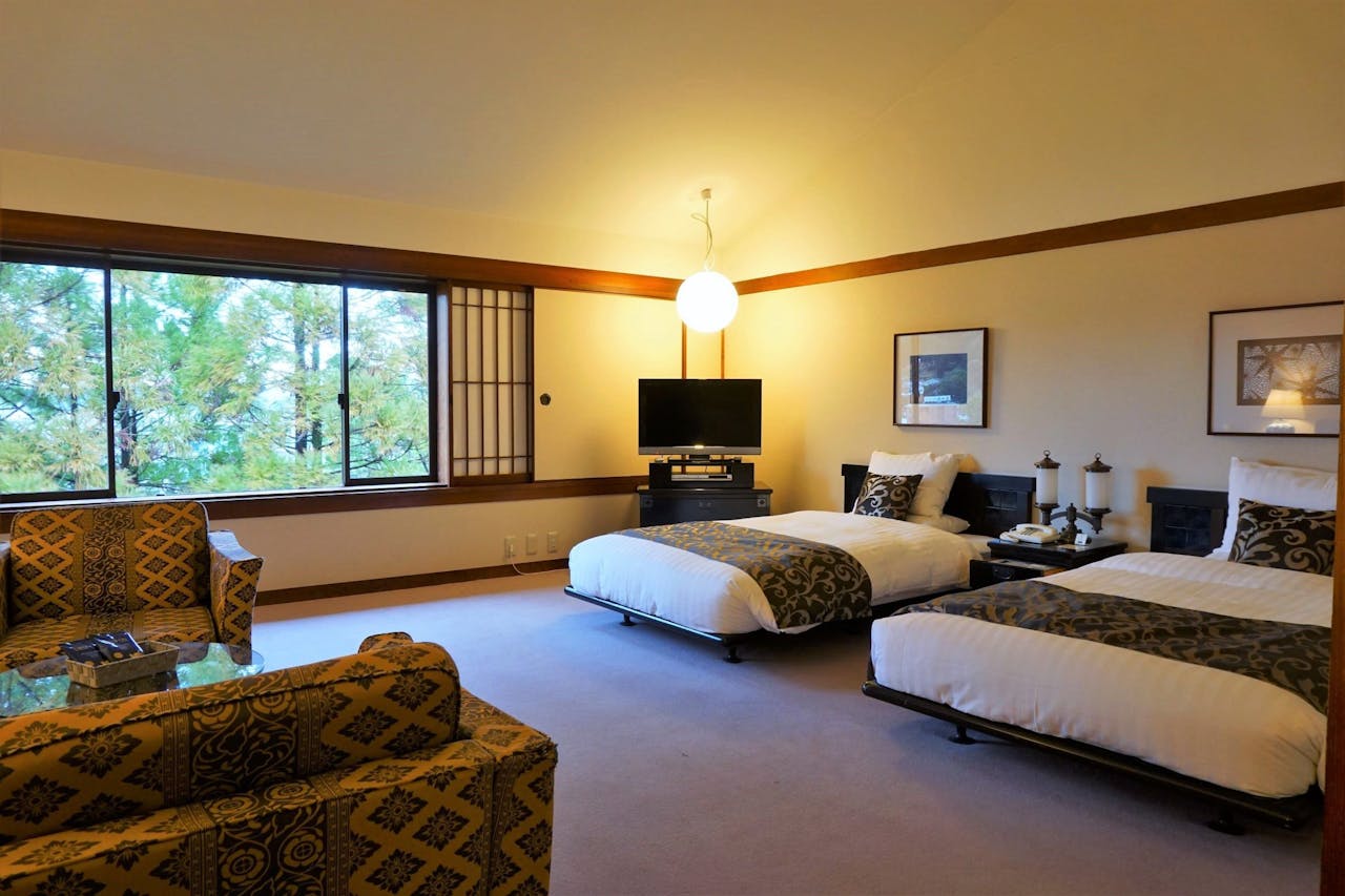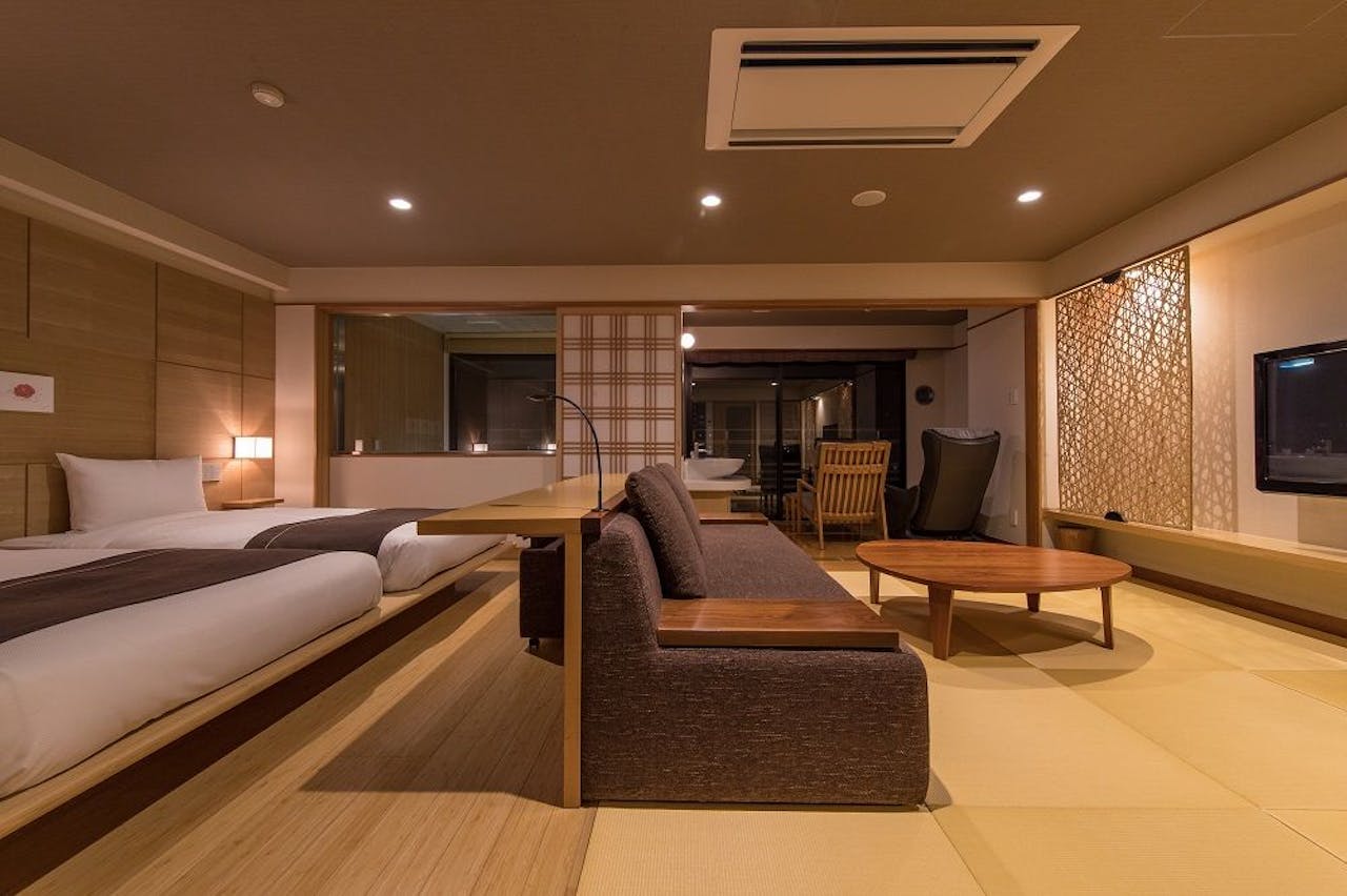 嬉野温泉一の高さを誇る「空中露天風呂」からの美しい眺めと、全室温泉完備が魅力のホテル。