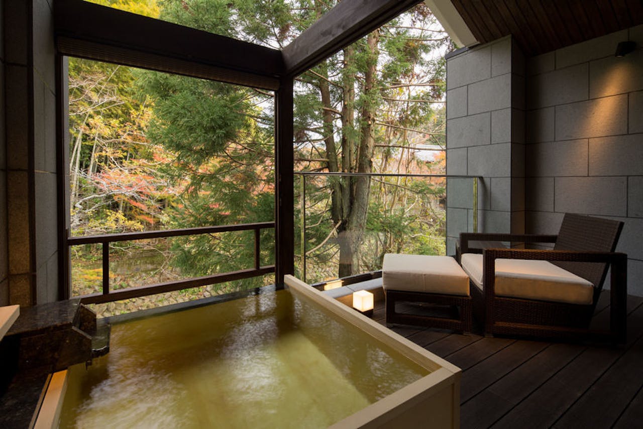 江戸時代から続く老舗旅館を改築した、和モダンなリゾート施設。古奈川に沿って設けられた、伊豆最古と伝わる古奈温泉の露天風呂や内風呂など6か所の温泉を、湯めぐりして楽しむことができます。