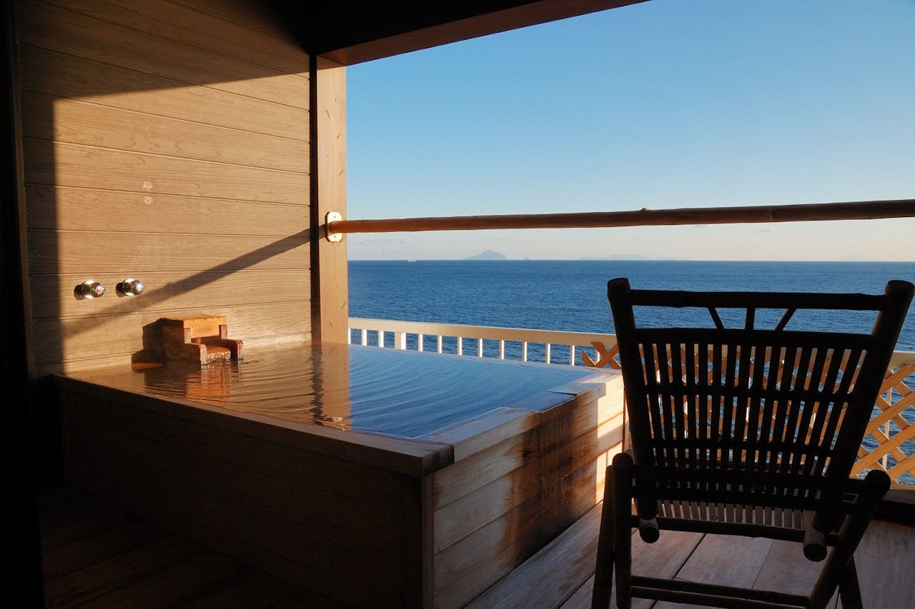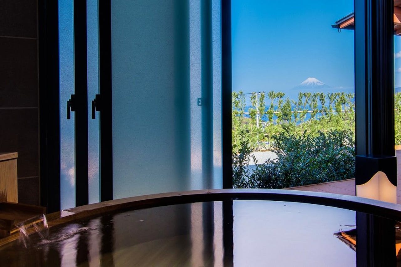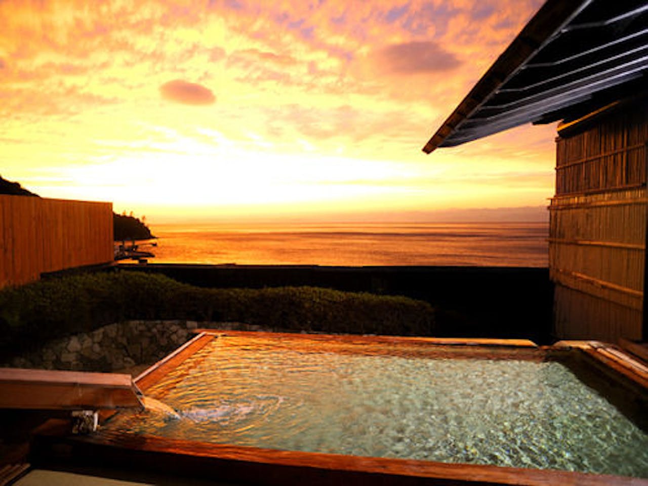 西伊豆最古の土肥温泉を堪能できる宿。客室は全て露天風呂・テラス付きの10棟のみ。駿河湾越しに富士山が見える抜群の立地です。
