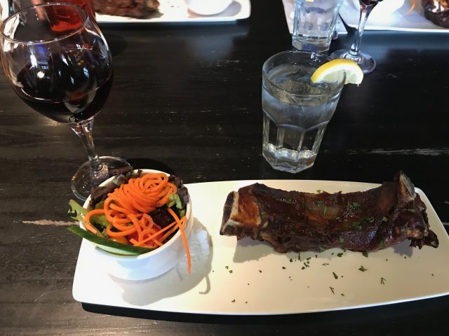ここでのメニューは、甘いドレッシングのかかったサラダと、BBQソースで味付けされたアルバータビーフの骨つき肉。お酒はお肉と相性の抜群の赤ワイン!